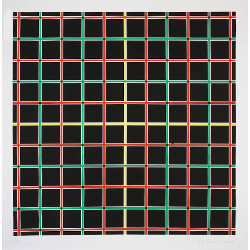 Grafički list iz grafičke mape od 12 motiva tiskanih  tehnikom sitotiska, na kojima Joško Eterović varira motiv kvadrata koristeći boju i različitu veličinu samog geometriskog oblika. Primjerak mape je pohranjen u MUO (Muzeju za umjetnost i obrt) i može se pogledati na ovom linku.